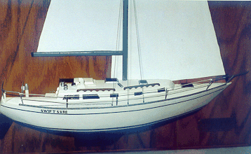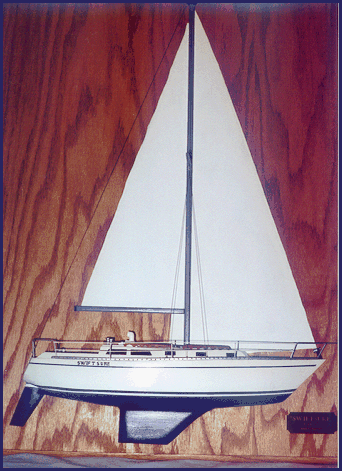This detailed half hull was made for Mr. and Mrs. Jim Cesare of Annapolis, MD as an anniversary gift. It is 1/2 inch scale and is 17 1/2 inches long.The backboard is oak and is 22 x 30 inches.